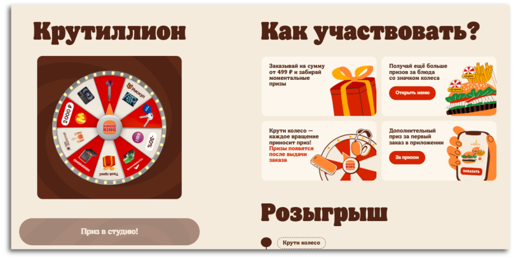BurgerKing разыгрывает призы через простую механику — колесо удачи.