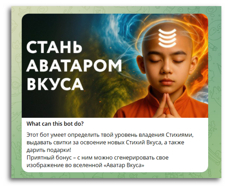 Сервис доставки еды MyBox запустил геймификацию через Telegram-бот. Игра называется «Аватар Вкуса». Если её пройти, можно поучаствовать в розыгрыше призов.