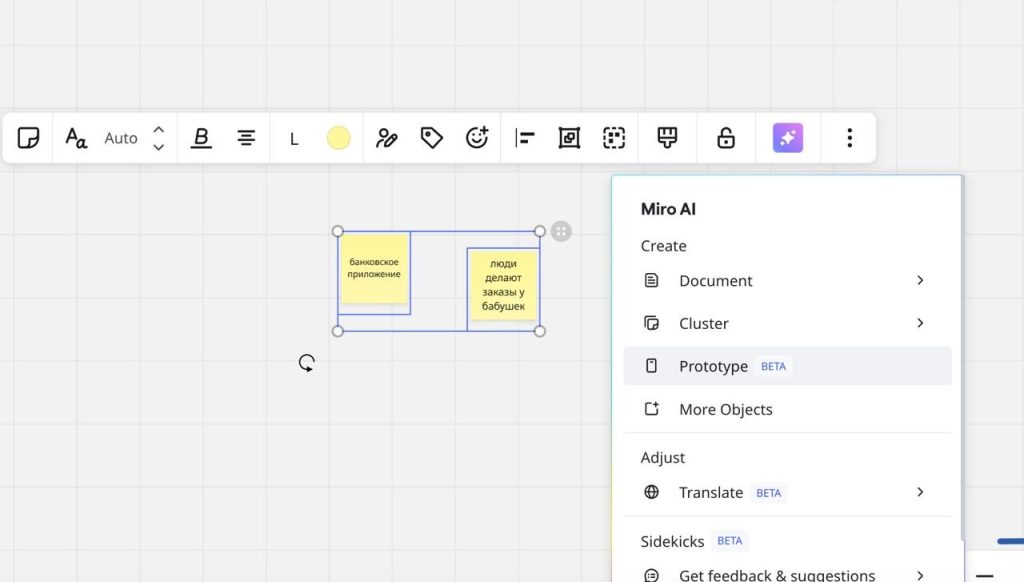 Когда выбрали решения, которые будете реализовывать, можно использовать нейросети, которые помогут быстро создать прототип. Например, в Miro это работает так: выделяете стикер и выбираете опцию — прототип. Так создаёте прообраз решения.