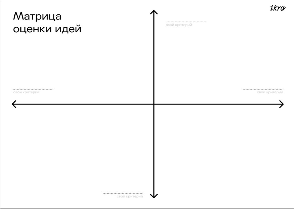- Для фильтрации идей также подходит фреймворк — матрица оценки идей. Задаёте критерии и размещаете идеи на пересечении линий.