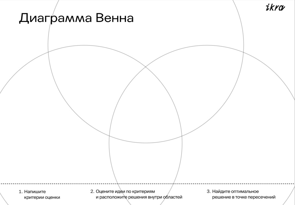 - Диаграмма Венна. Помогает найти совпадения между общностями. Такой приём помогает и в генерации, и в фильтрации идей.