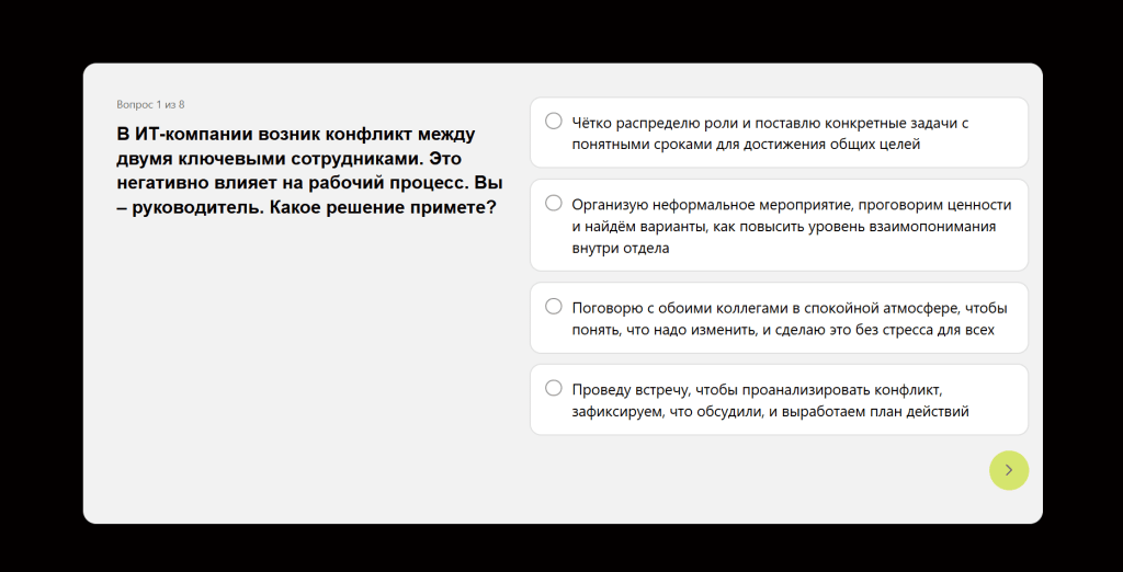 Тест построен на адаптированной типологии DISC и показывает, в каких условиях вы раскрываетесь максимально эффективно. Вопросы моделируют реальные рабочие ситуации, где нет правильных или неправильных ответов — только ваши предпочтительные пути мышления.