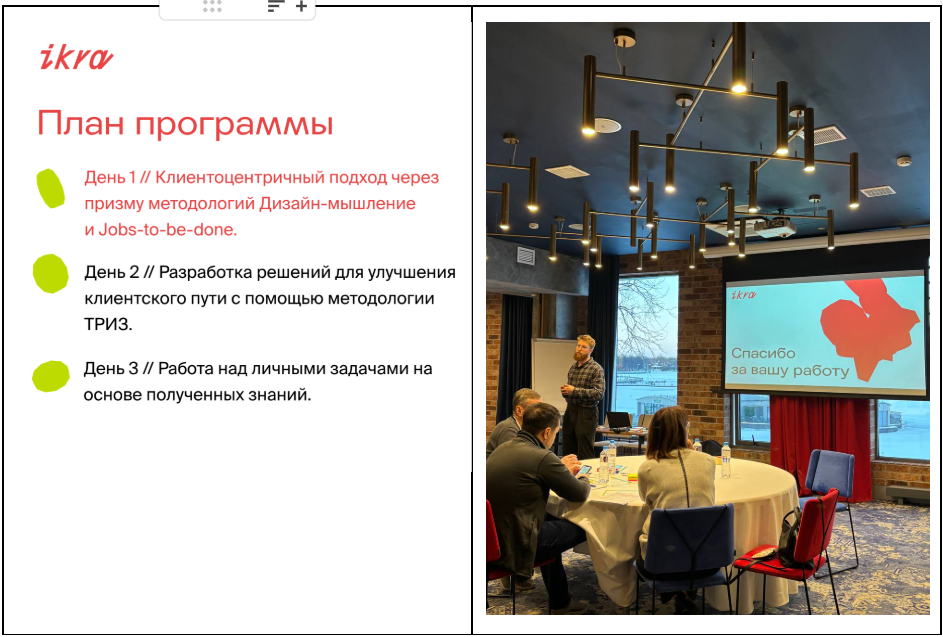 ИКРА предложила полноценное проектное обучение, интегрированное в логику Mini-MBA. Наша цель — за три дня интенсива дать участникам работающий инструментарий, а за три последующие недели помочь применить его к реальным рабочим вызовам. Лучшие проекты после защиты получали шанс на реализацию в зоне ответственности участников.