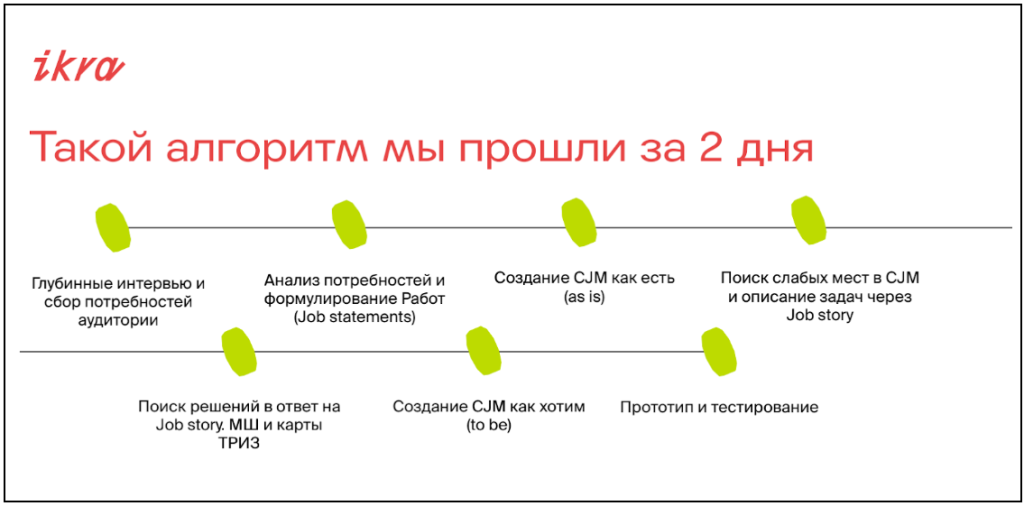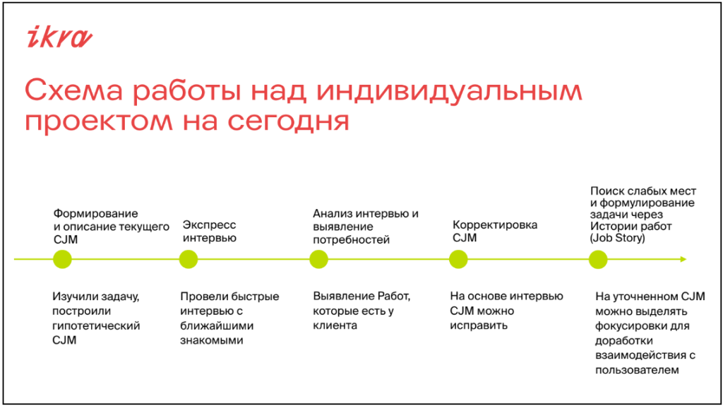 - Результат: К концу дня у всех был чёткий план действий на следующие три недели: провести экспресс-интервью, скорректировать гипотетический CJM, выявить Jobs-to-be-Done и сформулировать задачи для улучшения.
