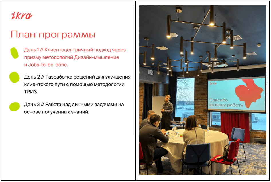 Ключевая задача для нашей команды обрисовалась чётко: научить будущих лидеров инструментам проектирования клиентского опыта, методам генерации идей (ТРИЗ, Латеральное мышление) и подходу Jobs-to-be-Done (JTBD), чтобы применять их в своих отделах и дочерних предприятиях.