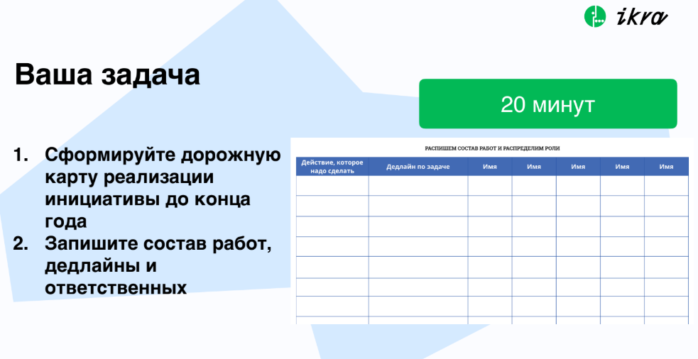 В итоге каждая команда отобрала 1–2 приоритетные инициативы, декомпозировала их на шаги, назначила ответственных и сроки. За 7 часов у команд были готовые планы на 4 месяца.