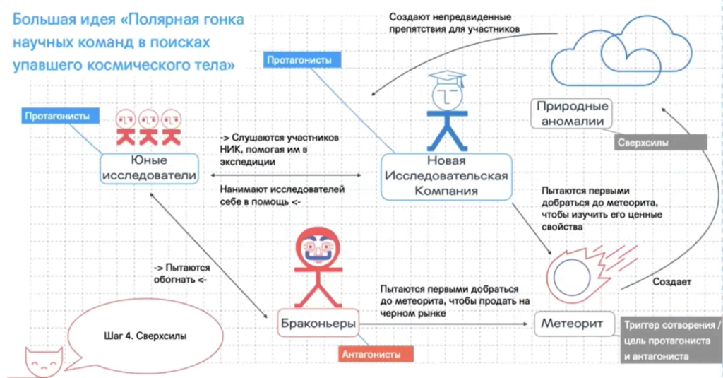 - Драматическая канва. Нужно придумать, как будет развиваться история по шагам. Здесь должны быть завязка (начало истории), кульминация и развязка.