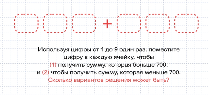 Ученикам предлагается разместить цифры от 1 до 9 (каждую — только один раз) в ячейках так, чтобы выполнялось одно из двух условий: полученная сумма была больше 700 или меньше 700.