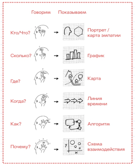 Как же составлять такие задания? Для этого удобно использовать фреймворк «Говорим и показываем» из книги Дэна Роэма «Back of the Napkin». Он предлагает набор основных вопросов («Кто?», «Где?», «Сколько?», «Почему?» и др.) и принципы их визуализации. Комбинируя эти элементы, можно создавать задания, которые легко понять, но которые открывают возможности для долгого и глубокого изучения.