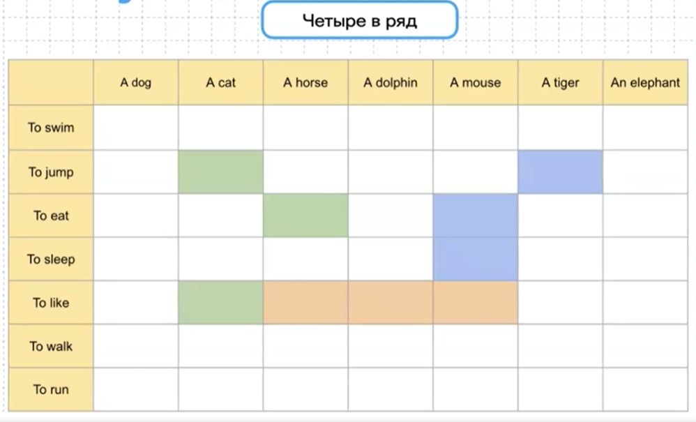 Это может быть вариация на тему игры «Четыре в ряд». Используется таблица, где по вертикали расположены существительные, а по горизонтали — глаголы.