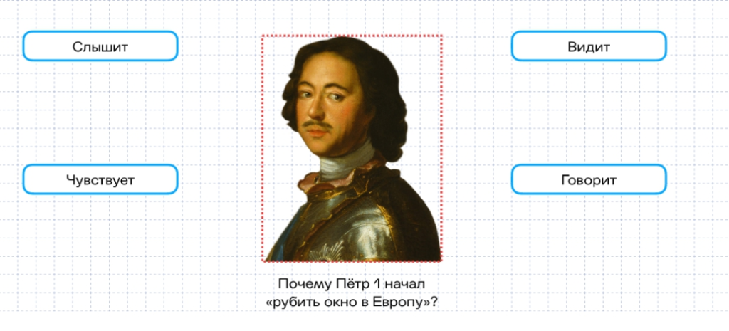 Например, вопрос: «Почему Пётр I начал “рубить окно в Европу”?» Ученики анализируют его действия не только через факты из учебника, но и через его восприятие: что он видел, слышал, чувствовал и говорил. Это позволяет глубже понять мотивы исторической личности.