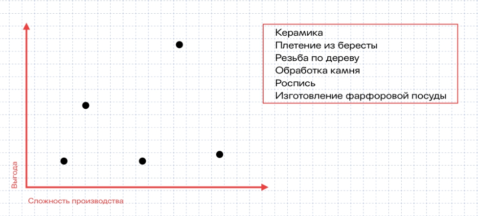 Здесь появляется график, на котором можно отслеживать разные форматы. У него есть две оси, которым нужно придумать название. Например, «Выгода» и «Сложность производства».
