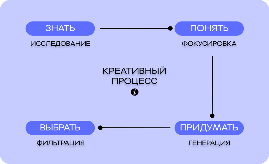 Чтобы понять, на каком этапе творческого процесса поможет ИИ, разберёмся, как работает креативное мышление. Любая идея проходит четыре стадии.